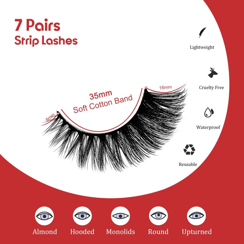 Product Name: Faux Mink Strip Eyelashes Natural Look Strip Lashes Wispy False Lash Strips Material: 100% Vegan material, cruelty free; Lash Length: 6mm, 8mm, 10mm, 12mm, 14mm, 16mm, 18mm, 20mm, 22mm, 25mm Ripple Effect: a natural sense of curling, very distinctive; 3D Effect enlarge eyes and make eyes more charming; Curling: C curl, D curl, J curl; Reusable Eyelashes: The lashes could be reused about 15-20 times with proper care, keep perfect curl after repeated use. Package: 7 pairs strip eyelashes