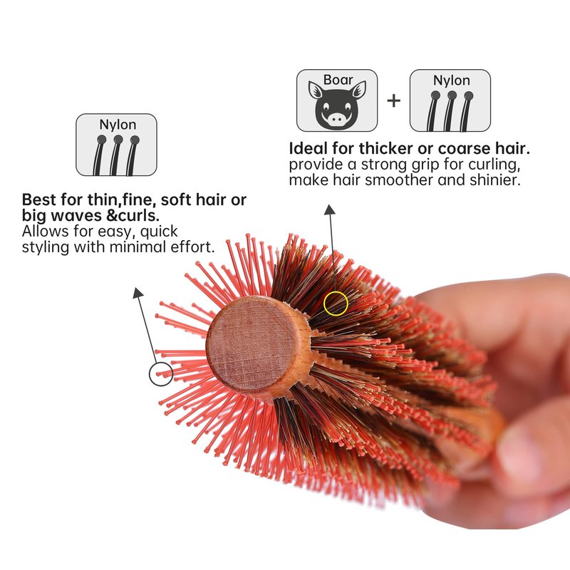 - The boar & nylon mixed bristles, making it ideal for thicker or coarse hair. The comb teeth provide a stronger grip for curling, while the boar bristles help make hair look smoother and shinier.