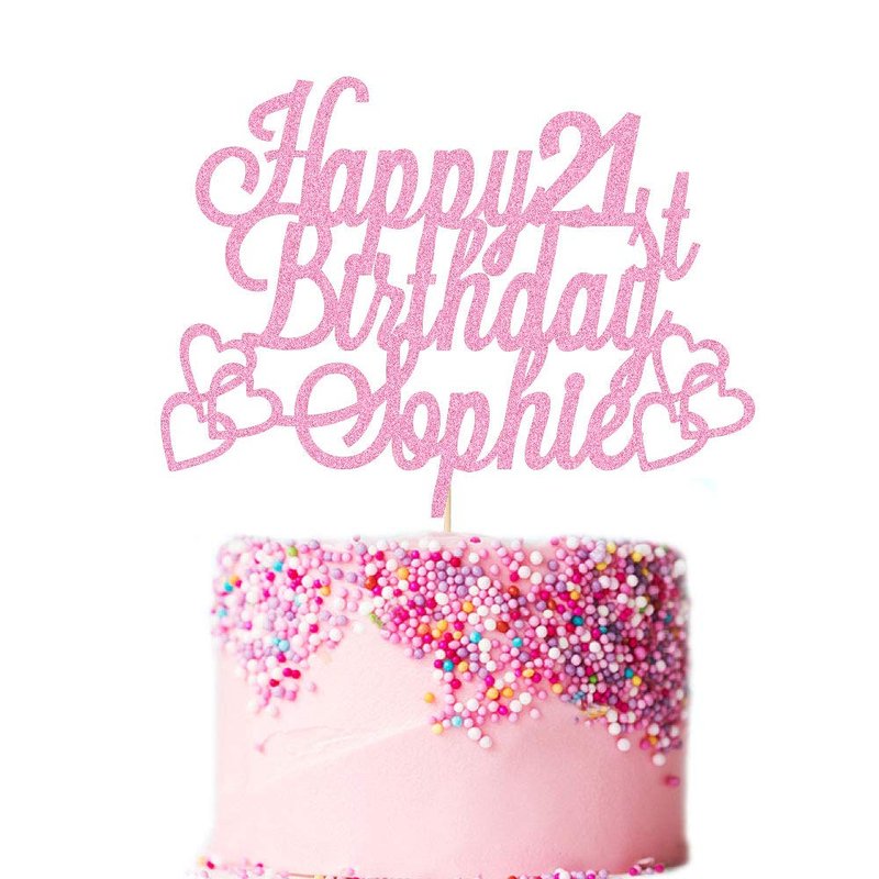 Personalized Happy Birthday Cake Topper | Custom Birthday Cake Decoration with Any Name Any Age 16 18 21 40 60 | Double Sided Glitter Card | Baby Pink