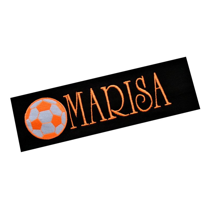 Black cotton stretch headband featuring the embroidered name or number of your choice. Next to the name is a 2 inch embroidered ball patch. Fits ages 5 years to adult and many colors available. Available in numbers 0-9 and letters A-Z and special characters: !, #, $, and &.amp;