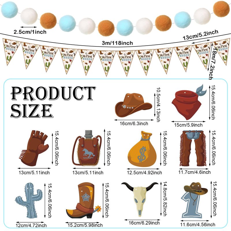 - Western Cowboy First Birthday Banners Set: the package comes with 5 pieces of cowboy birthday decorations, includes 1 cowboy 1st birthday party pompom ball garland, and 4 western cowboy party banners, an exquisite combination to satisfy your various decoration needs for little boy's first birthday party