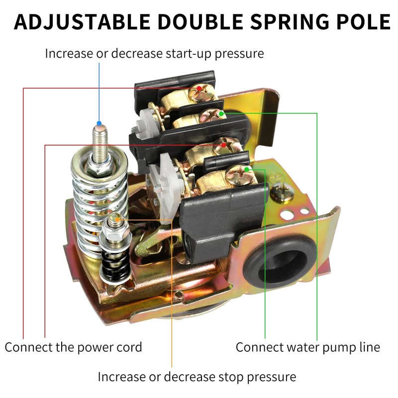 - ADJUSTABLE PRESSURE FUNCTION: This is a water pump pressure control switch for perfect pressure control. Pressure switch with 40-60 psi pressure setting range activates an electrically driven water pump within a power circuit when the adjustable rising and falling thresholds are reached.
