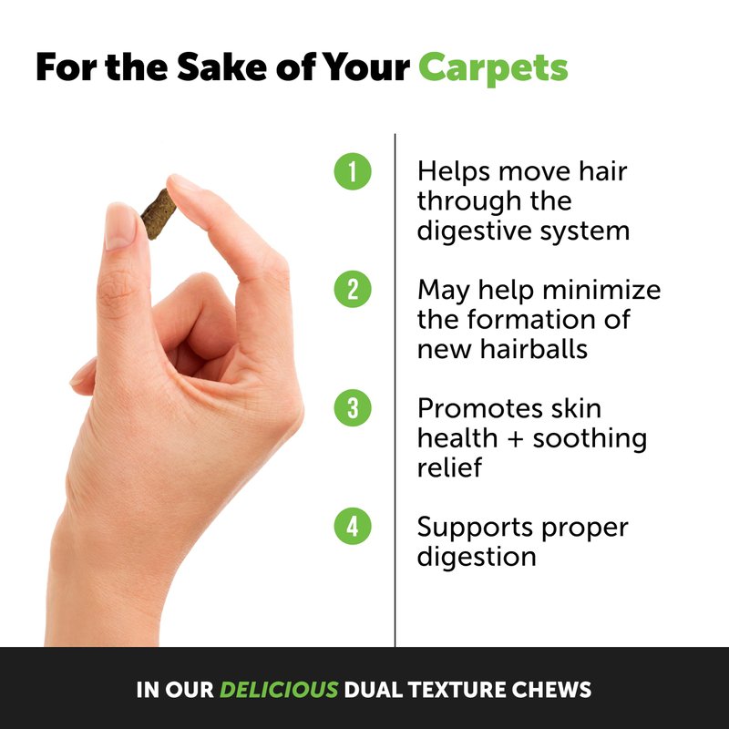 - A TEXTURE AND TASTE CATS LOVE: Hairball Support is a delicious chew that helps promote the removal of hairballs and support skin health. The result? Less of those horrible noises that have you running for the paper towels again. Powerful wholesome ingredients are packed inside a unique texture format that’s crunchy on the outside and creamy on the inside, offering a taste and texture combination that cats love.