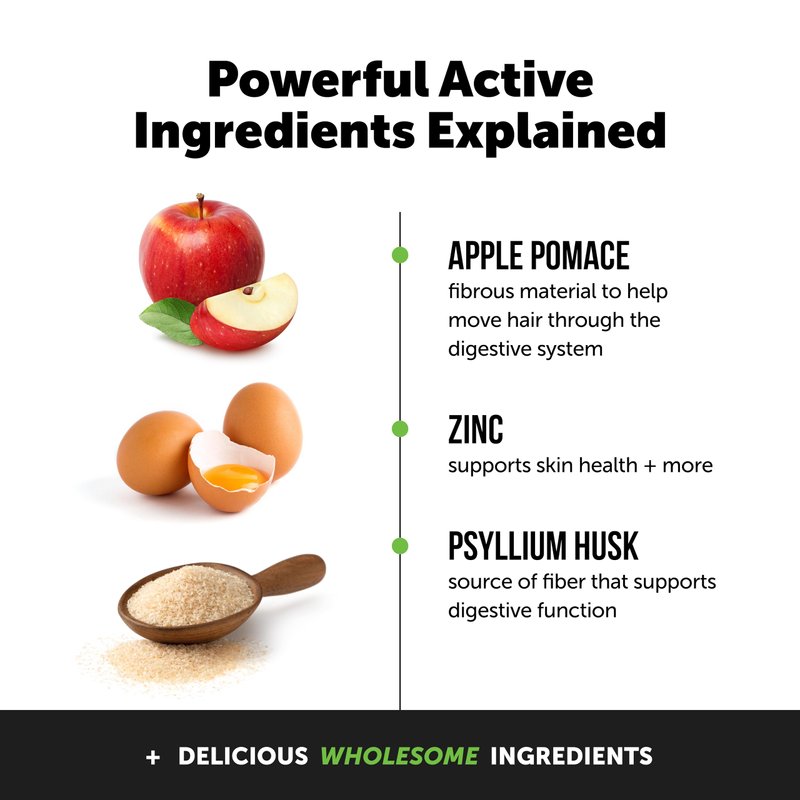 - MADE WITH NATURAL & PREMIUM INGREDIENTS LIKE APPLE POMACE, ZINC, AND PSYLLIUM HUSK: Hairball Support chews are filled with health-supporting ingredients you can trust. Apple Pomace helps maintain a healthy digestive system. Zinc helps maintain skin health, supports the immune system and cognition, and supports other key benefits! Psyllium Husk is frequently used in hairball and digestion products to support bowel function and health.