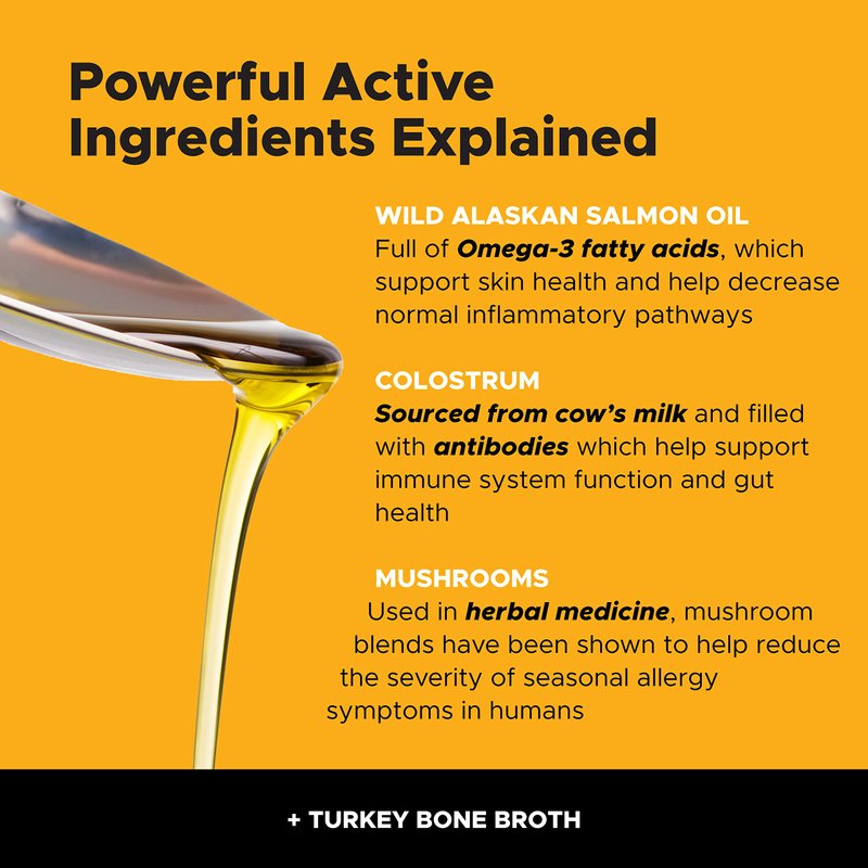 - Vet-recommended for Skin, Allergy + Immune Support - This delicious Anti-Scratch Salmon Oil has a turkey bone broth base and is vet-recommended to support your dog's immune system, promote joint health, soothe allergy-related skin issues and support normal inflammatory pathways