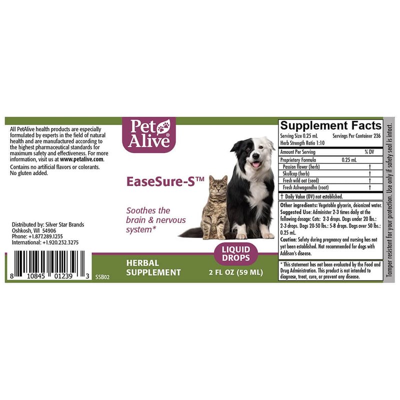 - SAFE & EFFECTIVE – EaseSure-S contains a scientifically chosen selection of ingredients known to support soothed nerves and your pet's natural equilibrium. Using a unique, therapeutic blend of Passion Flower, Skullcap, Wild Oat Seed and Ashwagandha in a concentrated liquid formula, EaseSure-S provides support for nervous system health, stability, and brain functioning in dogs and cats.