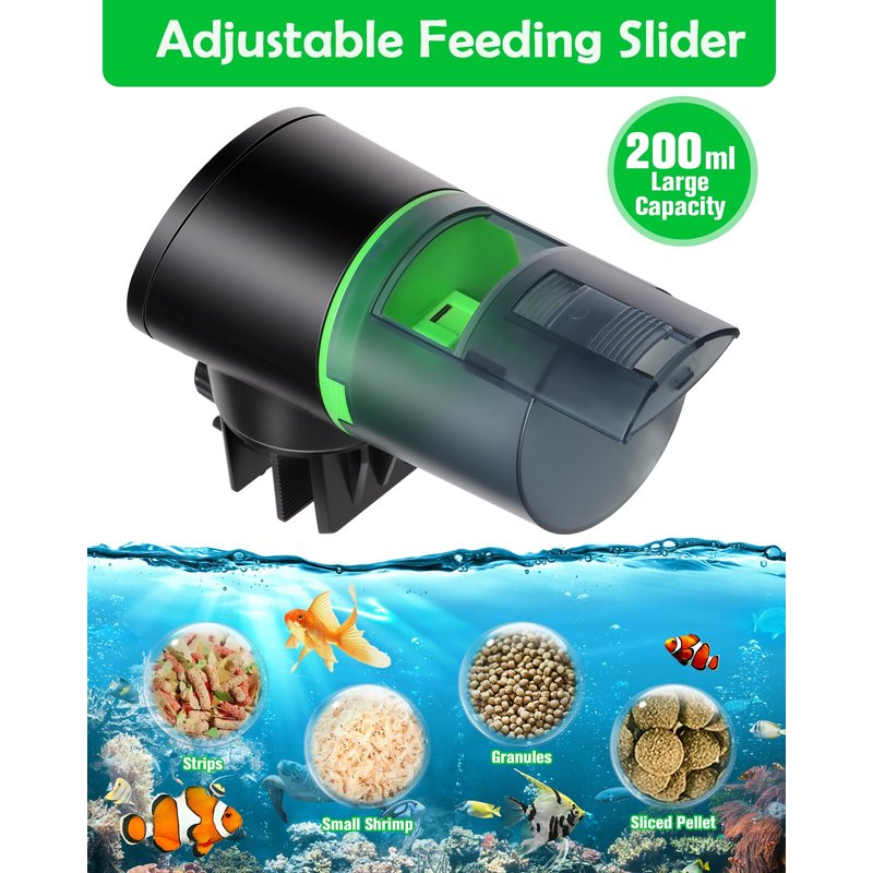 - Large Capacity & Adjustable Amount- 200ml large-capacity container fish tank automatic feeder is suitable for a variety of fish feed such as pellets, granules and powders. Simply adjust the slider to control the feeding amount.