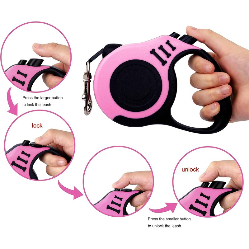 - Easy to use --- Two adjacent button for easily lock and unlock with one hand. Push the "big button" to brake, push the "small button" to pull leash back.