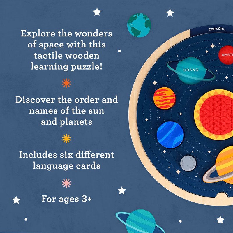 - PLANET PUZZLE FOR KIDS – Explore the wonders of space with this tactile wooden learning puzzle! Fit the nine chunky wooden pieces into the puzzle tray as you learn the names of the Sun and eight major planets in English, Dutch, French, German, Italian, and Spanish by easily switching the language cards.