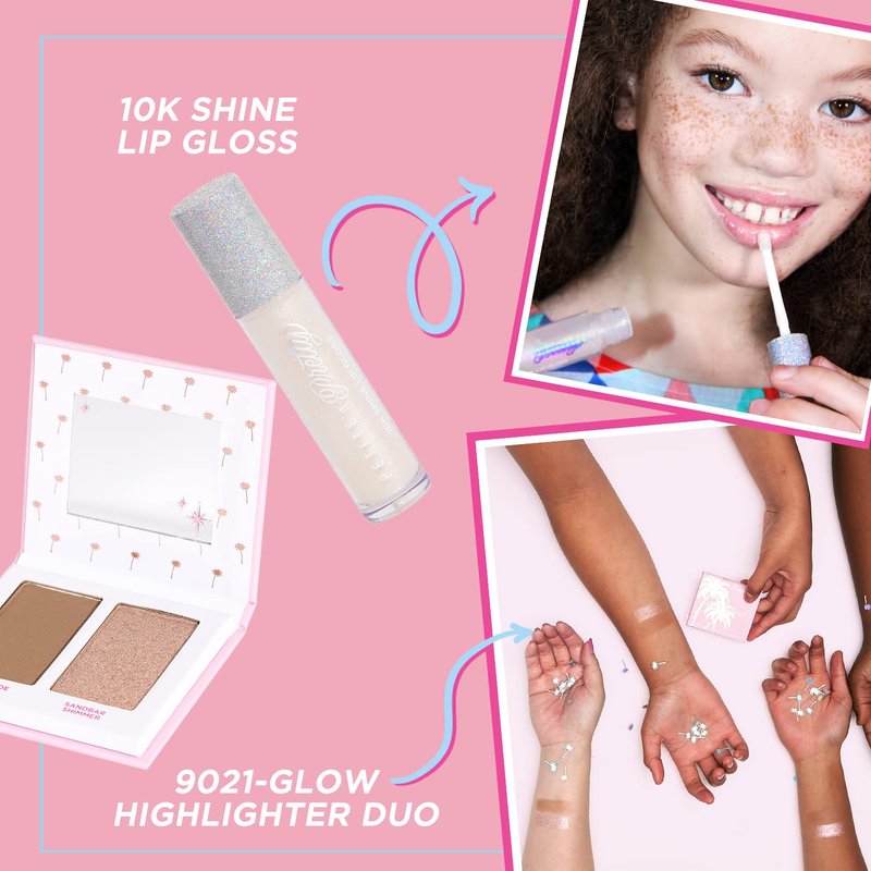 - EASY AND FUN TO APPLY: Blend Beachside Bronze onto cheeks, then follow with a sweep of Sandbar Shimmer on the high points of the face that naturally catch the light. Apply 10K Shine Lip Gloss onto clean lips for a high-shine finish and blend Gen Glitter onto clean skin or brush onto dry hair.