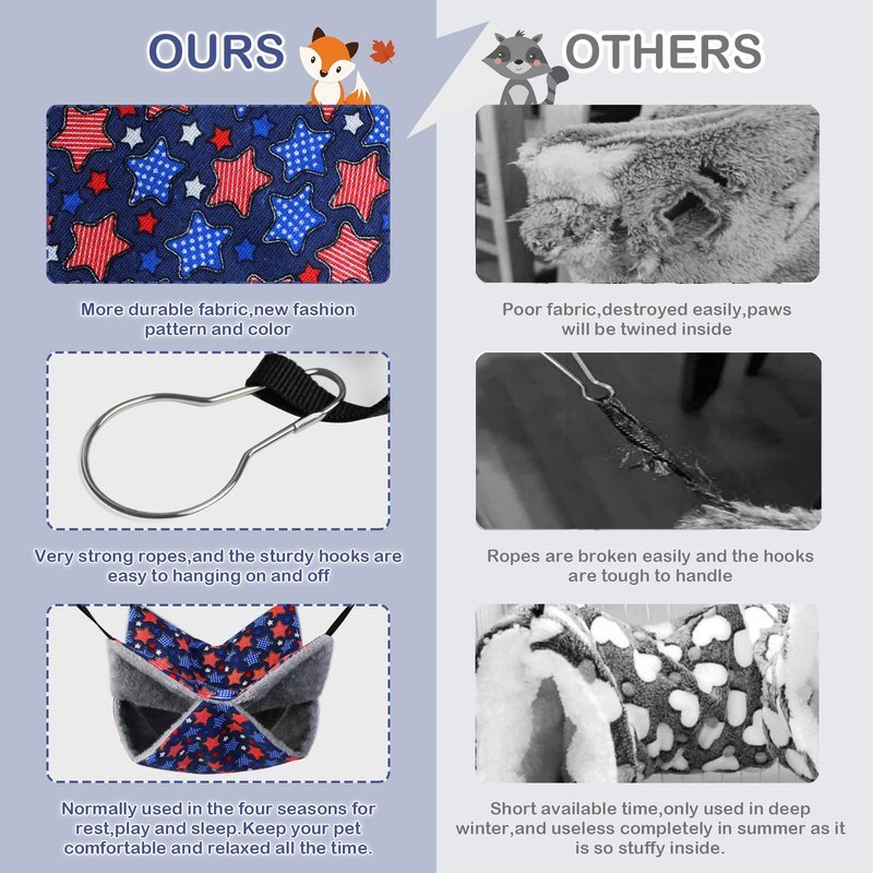 Design:This hanging hammock tunnel has a opening in the middel,and it can be more safe when your pet is playing or sleeping inside for ferret,guinea pig,hamster,rat,chinchilla,sugar glider,hedgehog,ground hog,totoro,parrot,squirrel,bunny,mouse,kitten,puppy or some other small critter.