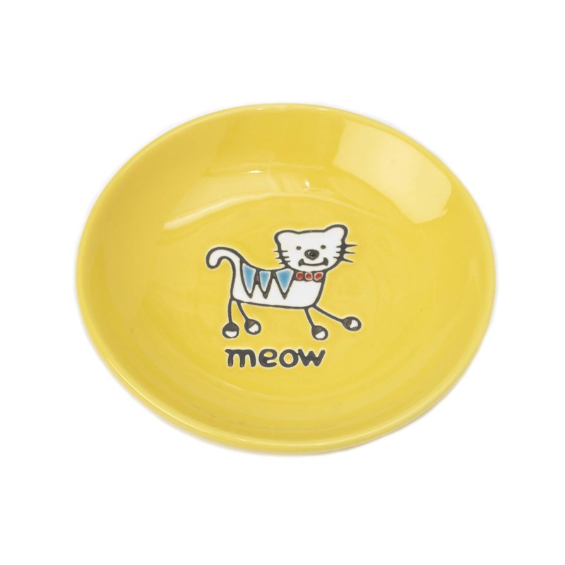 PetRageous 11019 Silly Kitty Dishwasher and Microwave Stoneware Cat Saucer 5-Inch Diameter 2.5-Ounce Capacity for Wet or Dry Cat Food Great For All Cats, Yellow