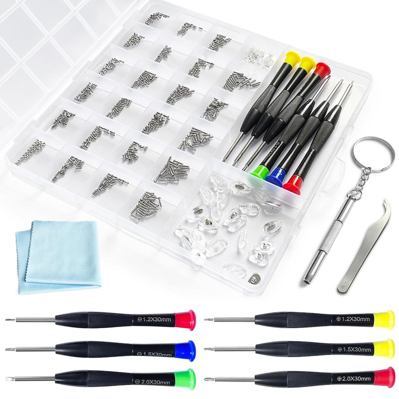 - In addition to the comprehensive screw set, our upgraded kit includes 6 glasses screwdrivers. This includes 3 Phillips screwdrivers and 3 flat head screwdrivers, ensuring that you have the right tool for any repair task. We have also selected high-quality nose pads, tweezers, and lens fabrics to further enhance your repair experience.
