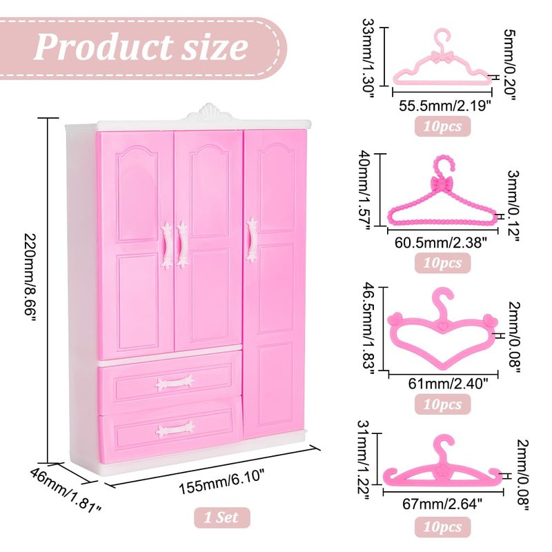 - Adorable Decoration: Mini doll wardrobe perfect for store doll clothes and jewelry, etc. It is convenient for you to quickly find the favorite doll clothes, and keep your doll house clean and tidy.