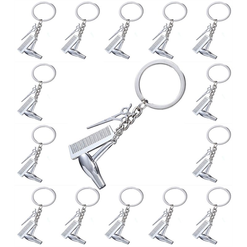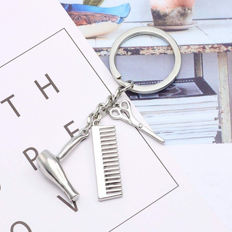 - 1.18" L silver scissors hangs on one side. The other side is decorated with a 1.26" L beautiful silver metal hair comb and a 1.06"Lx0.9"W silver hair dryer . Overall length of keychain is 3.54", including 24mm Diameter keyring.