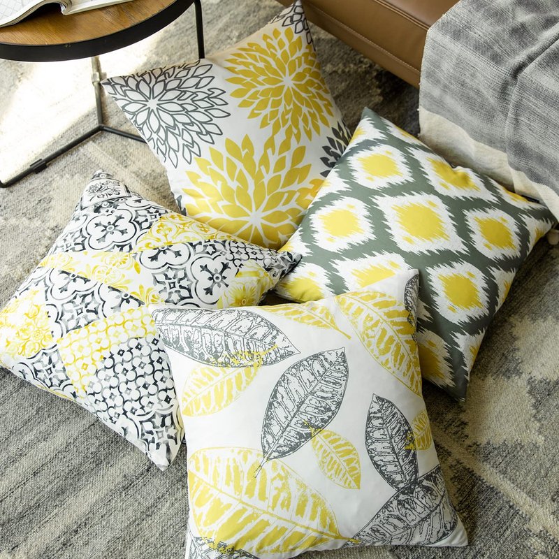 Phantoscope Set of 4 New Living Series Leaf Geometric Yellow and Grey Throw Decorative Pillow Cover Cushion Cover 18 x 18 inches 45 x 45 cm