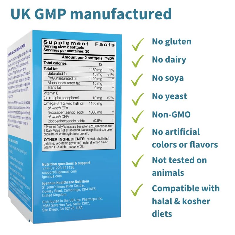 Pharmepa Restore, 1000mg Pure EPA Fish Oil, High Absorption rTG Omega-3, Triple Strength, Wild & Sustainable, Lemon Flavor, 1-Month Supply, 60 Softgels