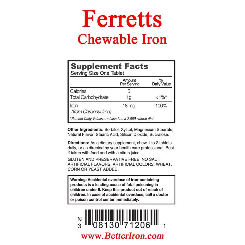 Ferretts chewable iron dietary supplement is a very pleasant tasting (Natural Lemon-Lime Flavored) dietary supplement that utilizes carbonyl iron. Carbonyl iron is a pure form of iron that is naturally regulated by the body, making it very gentle on the system. Ferretts chewable tablets are great for those persons that may have an iron deficiency but have difficulty swallowing pills.