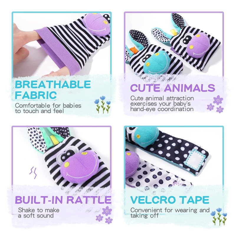 - SAFETY And COMFORTABLE : Made of breathable, non-toxic, and BPA-free fabrics, our baby sensory toys for wrist rattles and foot finder socks are CPC certified to ensure your baby's safety. The colorful and Cute animal designs are super soft and comfy to wear, and the adjustable velcro on the wrist rattles ensures a perfect fit