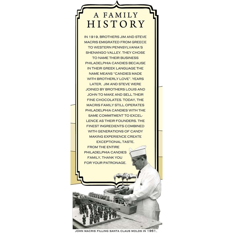 - Philadelphia Candies has been manufacturing fine chocolates in Hermitage, PA for nearly 100 years. The company was founded in 1919 and operates retail stores in Pennsylvania and Ohio. If you have questions or need assistance with an order, contact us through your Amazon account by clicking on our seller name and then "Contact the seller."