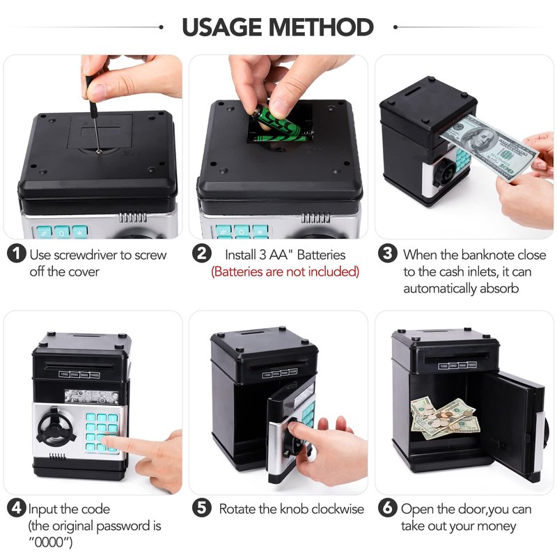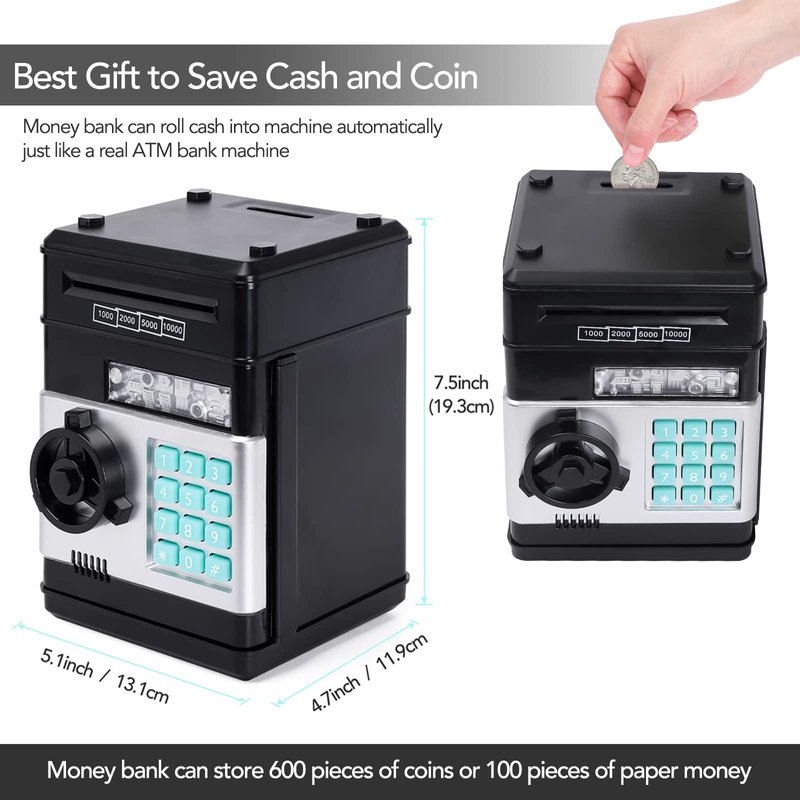 - 【High Quality Materials】Mini ATM electronic coin bank box made of 100% safe ABS plastic and electronic components. Body is made of environmentally friendly anti-fall material no odor and sturdy and not break easily. Saving box password piggy bank is good financial helper for kids.