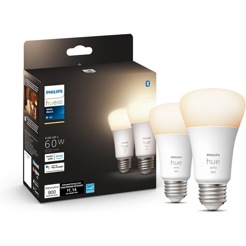 Philips Hue Smart 60W A19 LED Bulb - Soft Warm White Light - 2 Pack - 800LM - E26 - Indoor - Control with Hue App - Works with Alexa, Google Assistant and Apple Homekit