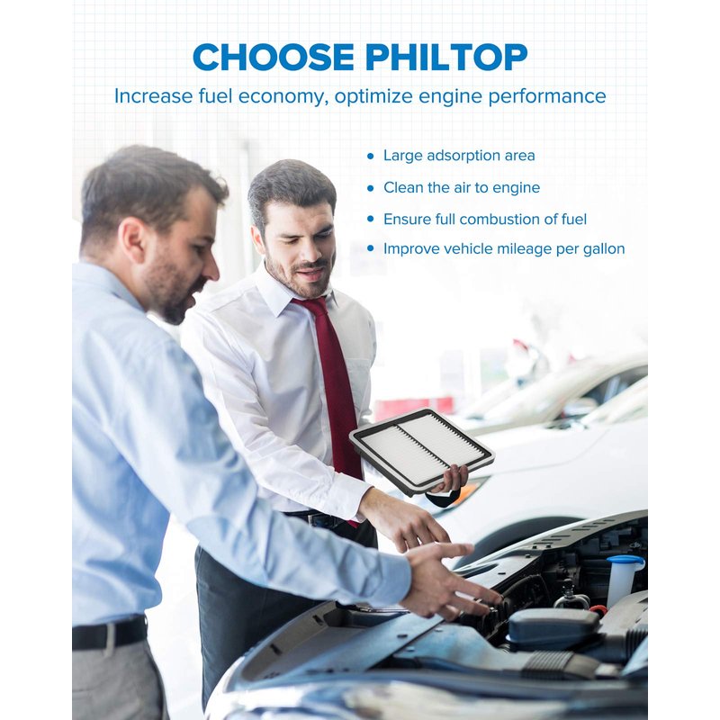 - Protect engine: inferior air filter or overused air filter is easy to get clogged and restrict airflow to result in engine misfire, even makes the car difficult to start. PHILTOP air filter has a superior dirt-holding capacity, offering 2X engine protection