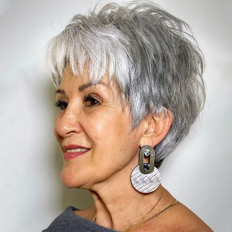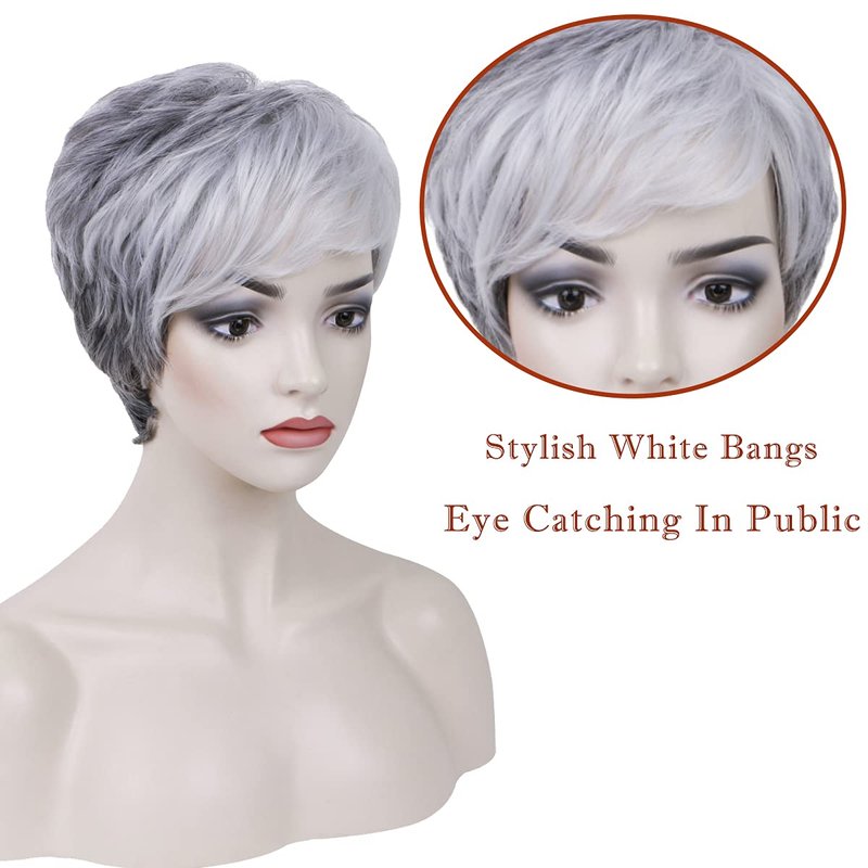 PHOCAS Short Curly Gray Pixie Wigs with Bangs Layered Short Wigs For Women Daliy Cosplay Synthet Short Cut Wigs
