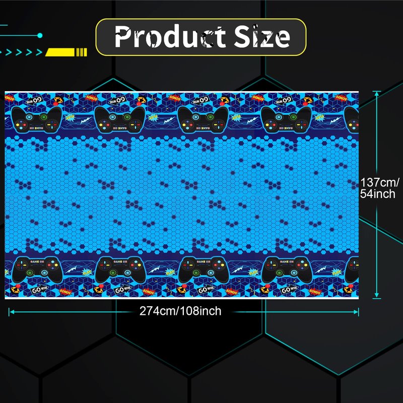 - Quantity and Size- 3PCS video gaming theme party table covers. Tablecloth 54×108inch (137×274cm). Large enough for most tables or you can use two or three pieces at once for the party or event with more people.