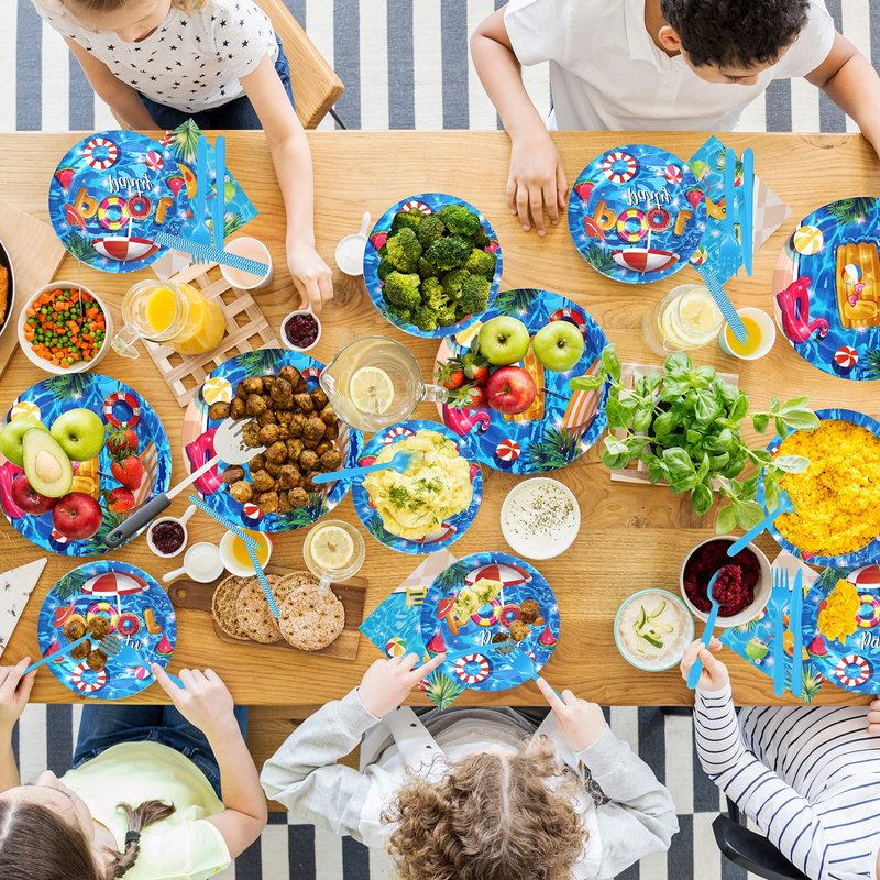 - QUICK AND EASY CLEAN UP: Our birthday pool party decorations are suitable for onetime use and are easy to clean up. You can collect the tableware kit and dispose of them after the party, saving you cleaning time, so you can enjoy time with family and friends.