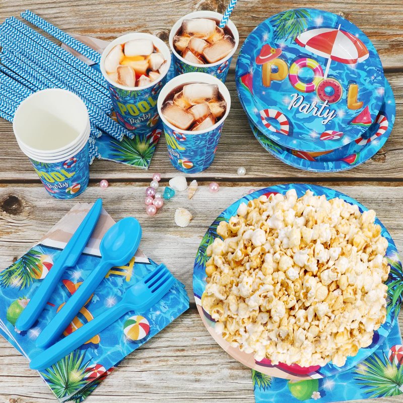 - PACKAGE INCLUDES: You will receive a pool beach summer party supplies set contains enough beach party tableware for 8 guests. Includes 8 (9")round dinner plates, 8 (7") round dessert plates, 8 paper cups, 20 pool party napkins, 8 plastic knives, 8 plastic forks, 8 plastic spoons, 25 straws. Our pool beach themed tableware set will help you to make your party more interesting and attractive.