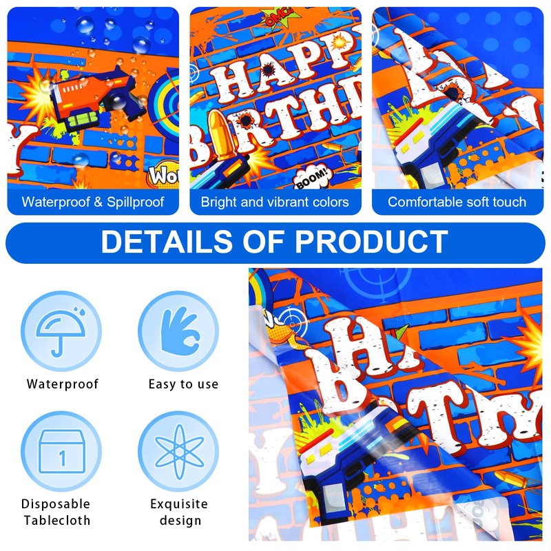 - EFFORTLESS CLEANUP WITH DISPOSABLE EASE: Bid farewell to post-battle mess – our tablecloths are your cleanup allies! Waterproof and spill-proof, these table covers make quick work of any spills or debris. After your dart war event, simply dispose of them, ensuring a trouble-free and easy cleanup. These table covers are essential nerf party supplies for boys birthday and other dart war party supplies.