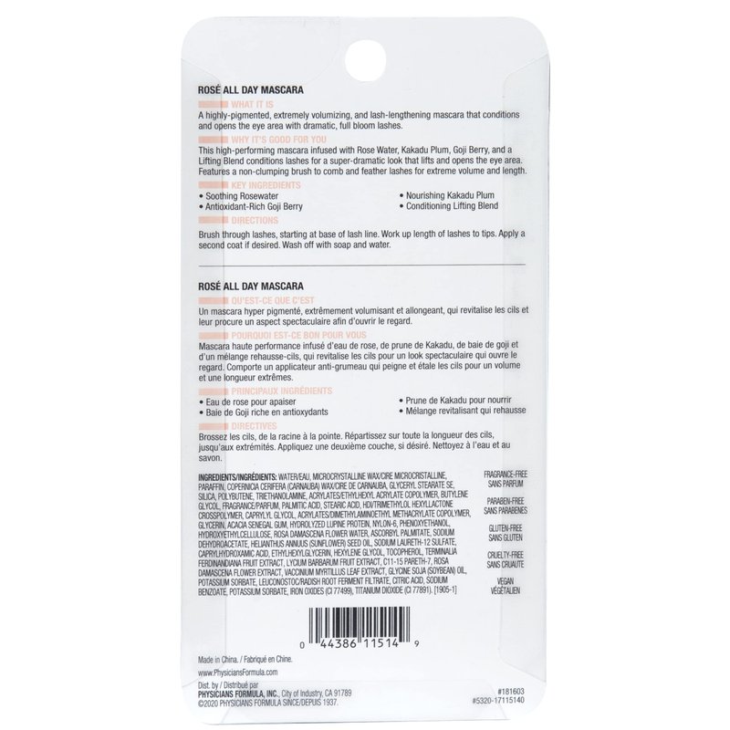 Physicians Formula Rosé All Day Mascara Black Volumizing, Hypoallergenic, Conditioning, Nourishing, Lifting, Lengthening, Dermatologist Approved