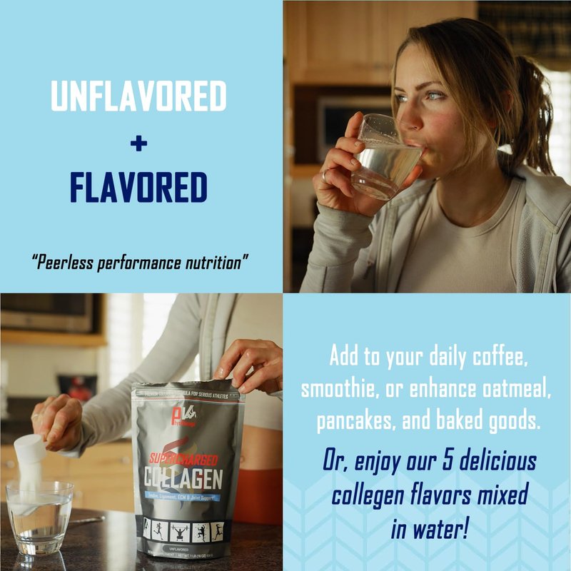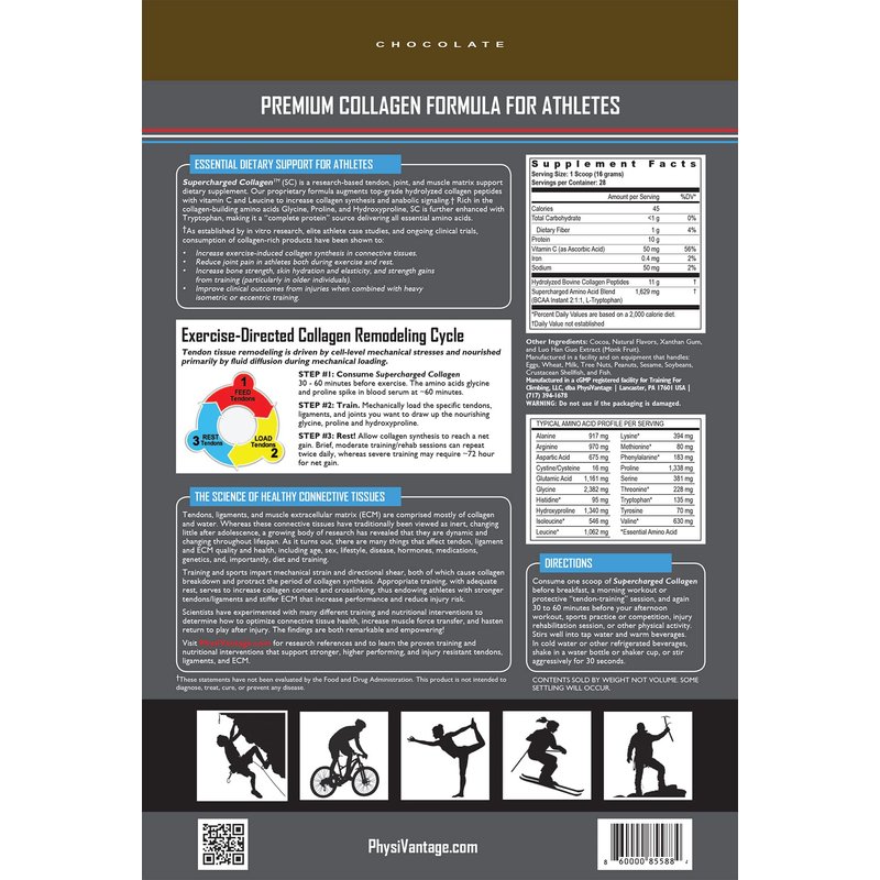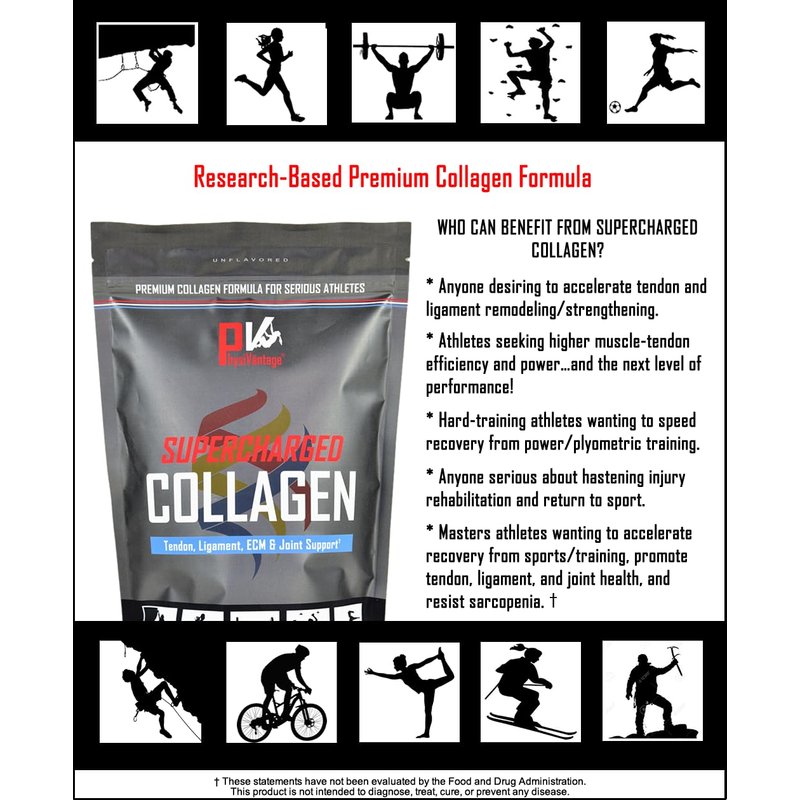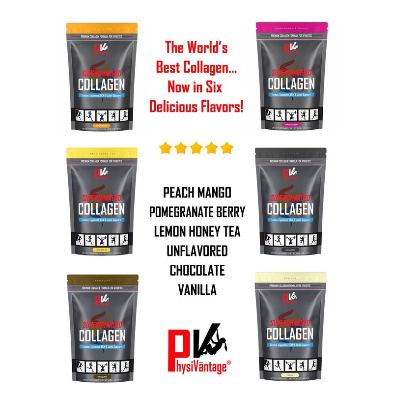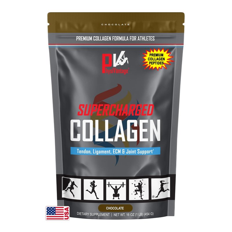 Supercharged Collagen is a research-based, athlete-proven supplement that supports collagen synthesis in connective tissues, joints, skin, and force-transfer muscle matrix. This industry-leading collagen is used daily by professional athletes, as well as thousands of recreational, masters, and elite-level athletes, to promote connective tissue health, accelerate recovery from exercise, and accelerate return-to-sport after injury. This is NOT your Grandmother's "hair & nails support" as widely sold. PhysiVāntage Supercharged Collagen is a novel blend of top-grade (grass-fed, pasture-raised, non-GMO) hydrolyzed collagen augmented with vitamin C and BCAAs to increase collagen synthesis and signaling. Rich in the collagen-building amino acids (glycine, proline, and hydroxyproline), Supercharged Collagen is further enhanced with l-tryptophan, making it a complete protein source delivering all essential amino acids to tendons, ligaments, and muscle matrix (ECM). In aggregate, Supercharged Collagen is the most advanced connective tissue and joint support supplement available for hard-training athletes. Available is three delicious flavors (Chocolate, Vanilla, and Peach Mango) as well as the original unflavored (natural tasting & smelling). Contains NO sugar, NO artificial flavors, and NO artificial sweeteners. 👉 WHO CAN BENEFIT FROM SUPERCHARGED COLLAGEN? 💪 Athletes in search of higher muscle-tendon efficiency and power…and the next level of performance! 💪 Anyone desiring to accelerate tendon and ligament remodeling/strengthening, and reduce injury risk. 💪 Anyone serious about hastening injury rehabilitation & return to peak performance. 💪 Youth athletes with growth plate pain or recovering from injury. 💪 Masters athletes wanting to accelerate recovery from sports/training and resist sarcopenia. 💪 Anyone wanting to improve skin elasticity and hydration. 💪 Hard-training athletes wanting to speed recovery from power/plyometric/high-intensity training sessions.