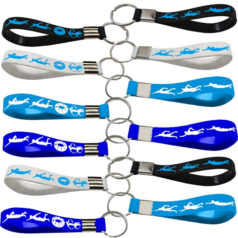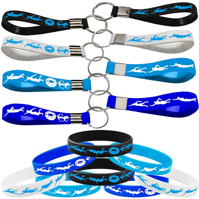 - SWIMMING THEME PARTY GIFT: Swimming bracelets and keychains 24pcs, including 6pcs each of blue, navy blue, black and white colors, the swimming action pattern with sea water color scheme matches well with the party, and the number of styles is rich, very suitable as party gifts.