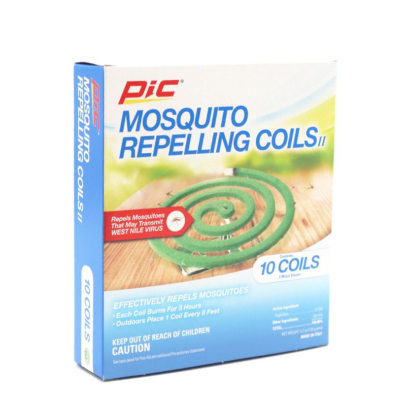 PIC Mosquito Repellent Coils contain a proven formula of Pyrethrum. Each coil lasts up to 5 to 7 hours. Comes with reusable metal stands. Mosquito Coils help repel mosquitoes in confined areas outdoors. It is useful in places where there is little or no breeze such as patios and porches. Do not use indoors and see packaging for additional instructions for proper use. Coils repel mosquitoes and are effective when positioned every 10 feet. Each coil burns for 5-7 hours and is best used outside on patios and porches. For outdoor use only. Use the enclosed metal holder for positioning the coil above the surface of your patio table or wherever you place the coil for repelling mosquitoes. Note the direction of any breeze or wind when placing the coil around outdoor activity.