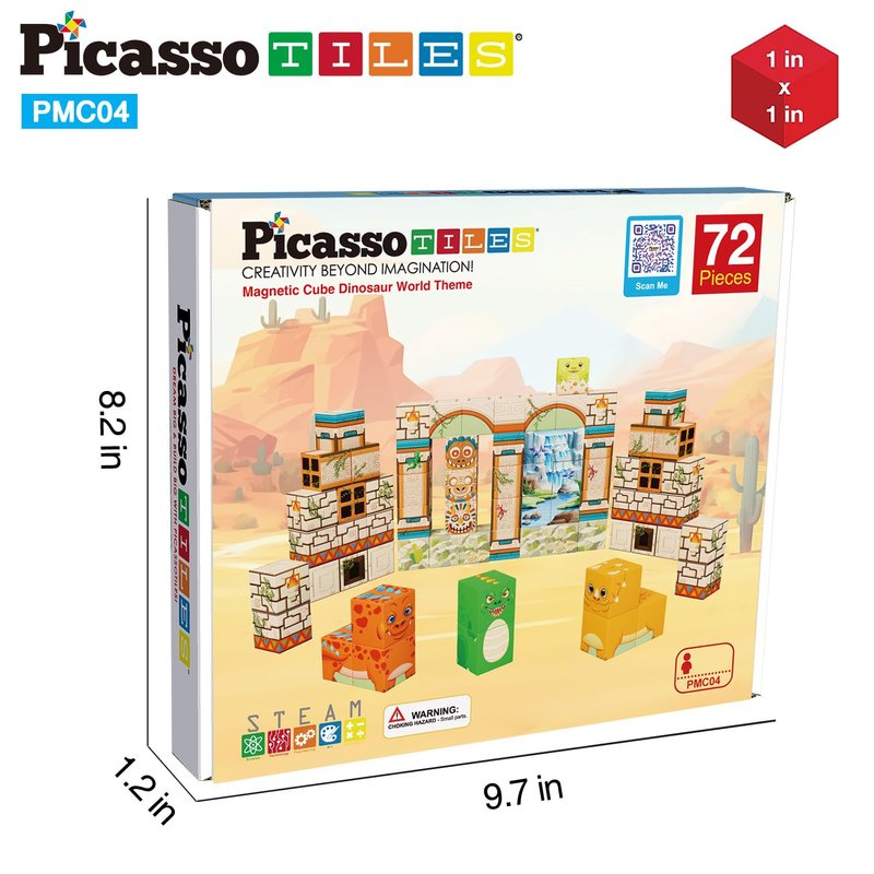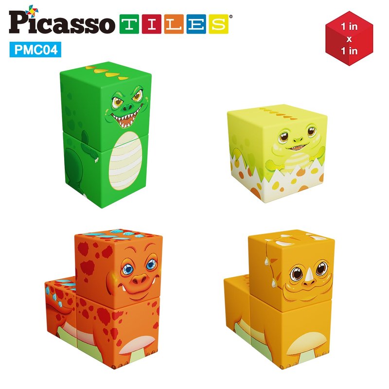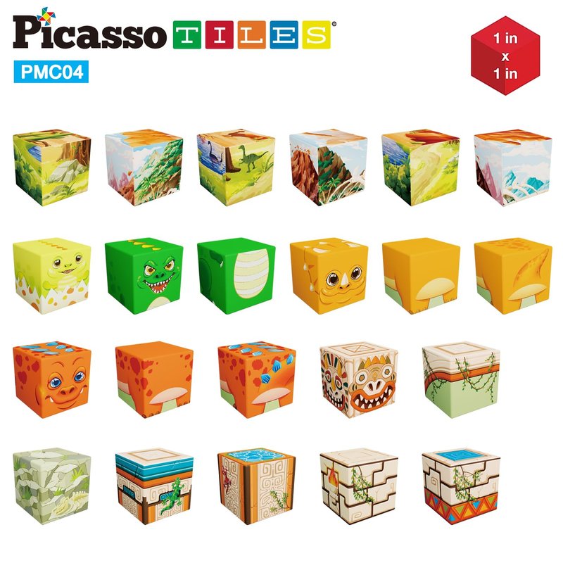 - DREAM BIG & BUILD BIG: PicassoTiles prehistoric dino world magnetic cubes playset features 72 magnet pieces with 6 pictures per cube for a total of 432 puzzle prints. Each individual cubes measuring 1”x1.” Each cube boasts printed designs, allowing you to create 6 unique puzzle landscapes, a building structure, and 4 dinosaur characters. Stack the puzzles and dinosaurs onto the structure or set them up for solo play. The possibilities are endless.