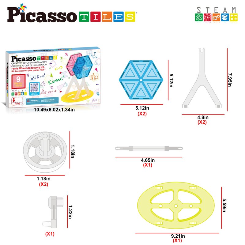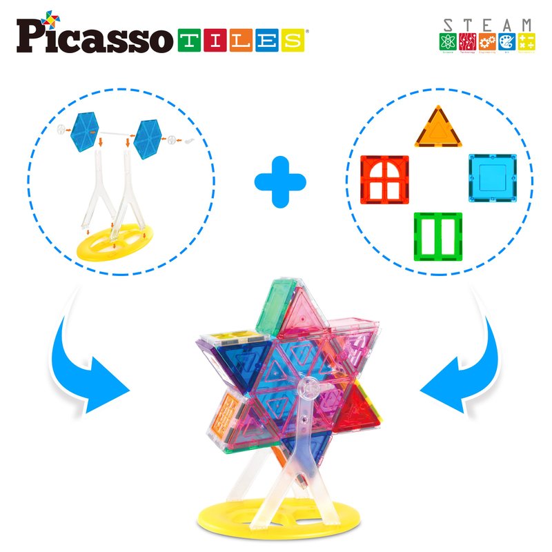 - BUILD BIG & DREAM BIG: Our 9pcs Ferris wheel accessory magnet tiles building block kit is compatible with our legacy PicassoTiles magnetic tile construction blocks, which connects to its base structure. Construct dynamic structures and attach them to this add-on set and watch your creations spin and rotate 360 degrees. Create entertaining moving constructions, from rotating stars, flowers, and triangles, and other exciting possibilities. Includes pieces required to build magnetic spinning structures.