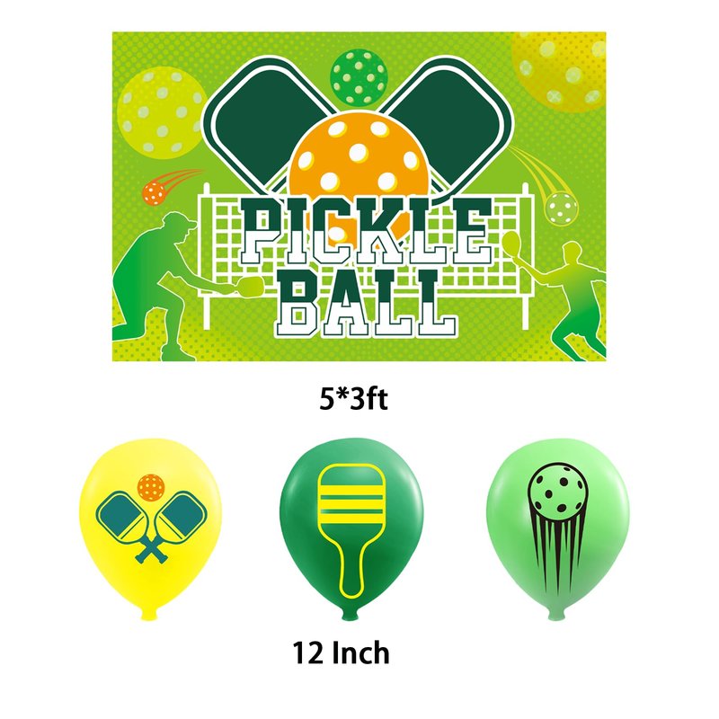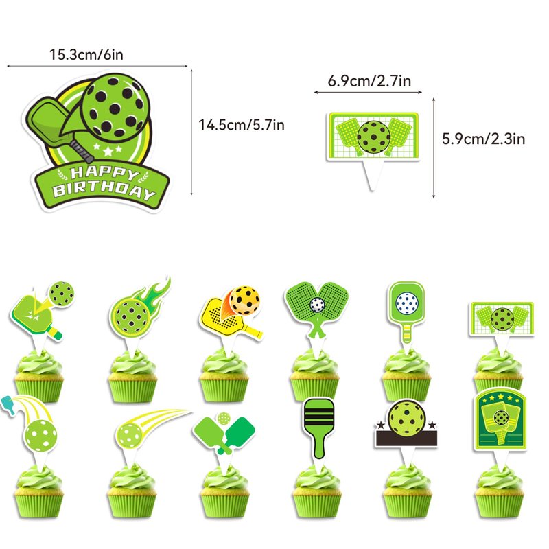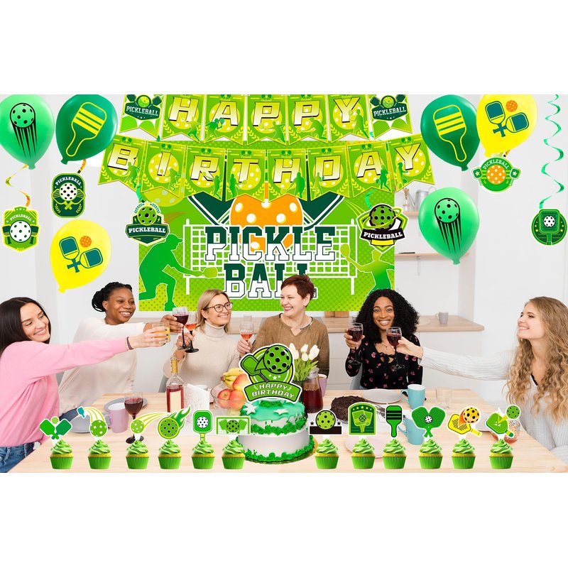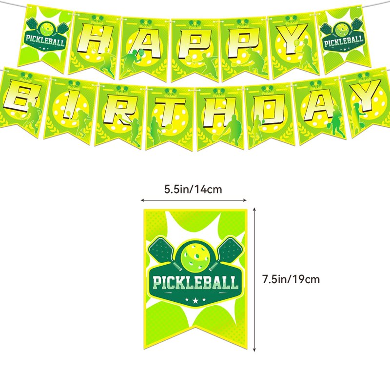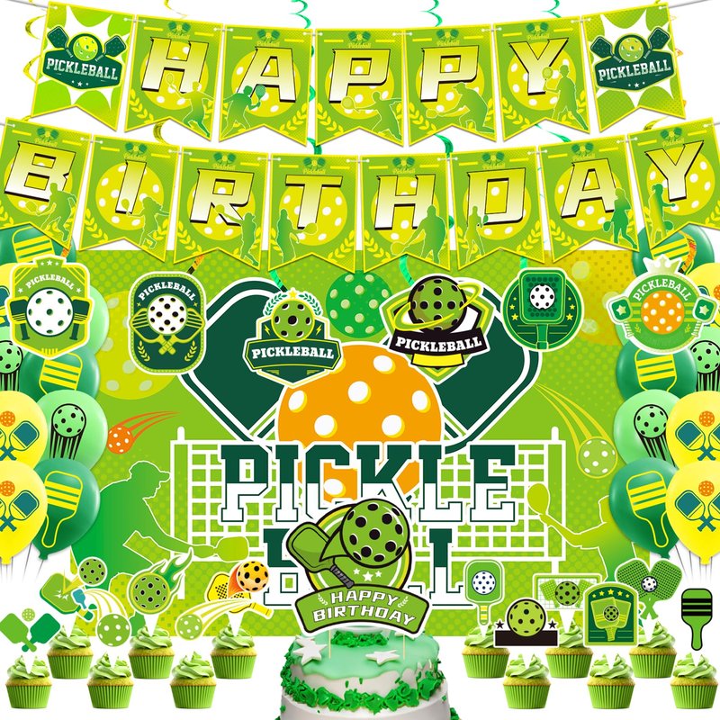- Pickleball Birthday Party Supplies: Package includes 1 set pickleball happy birthday banner, 1 pcs 5*3ft pickleball backdrop, 1 pcs pickleball happy birthday cake topper, 6 pcs pickleball hanging swirls, 12 pcs pickleball cupcake toppers, 18 pcs pickleball balloons, 1 ribbon. Pickleball party decorations provide you with a perfect birthday party.