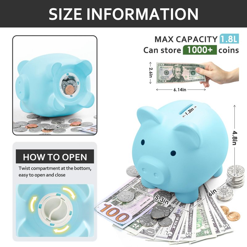 - Unbreakable Plastic Piggy Bank: Size:15*12*14cm. Solid thickened plastic pink piggy bank. Large capacity money jar can storage 1000+ coins. Piggy bank for kids adults, not very big, but excellent as gift for kids to start saving money. Great coin bank money jar for adults kids with saving goals. Unbreakable bank for kids is IMPORTANT.