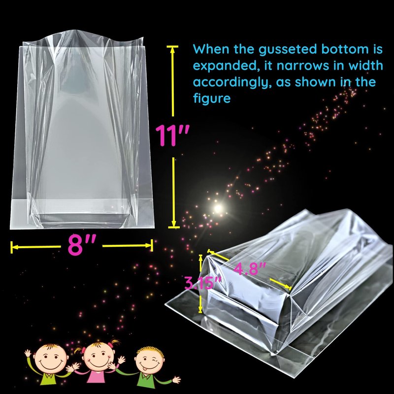 - [1.5mils Thickness with 3.15" Wide Bottom Gusset] These 8x11 clear plastic gift bags have a durable thickness of 1.5 mils, much thicker than others, and feature an extra-wide 3.15-inch bottom gusset for increased capacity. The wide and flat bottom design allows the 8x11 clear party favor bags to stand upright easily, creating an attractive presentation. The higher-quality plastic material enhances the tear and rip resistance of the 8x11 clear cellophane bags.