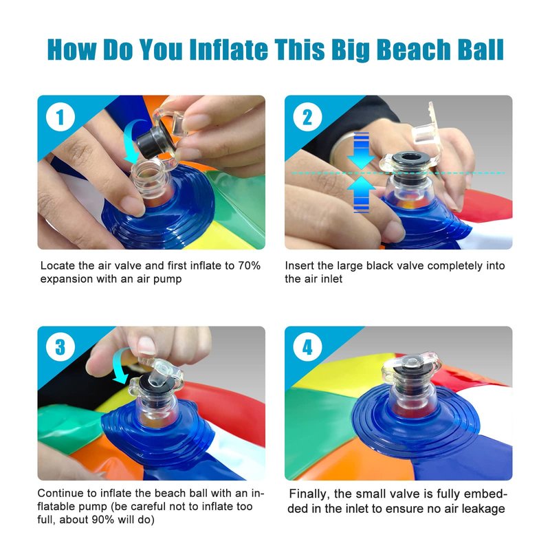 - Easy to Inflate: The beach ball has double valves, good sealing. Designed for keeping air for a long time. Due to the huge size of the beach ball. It is recommended to use an air pump to inflate