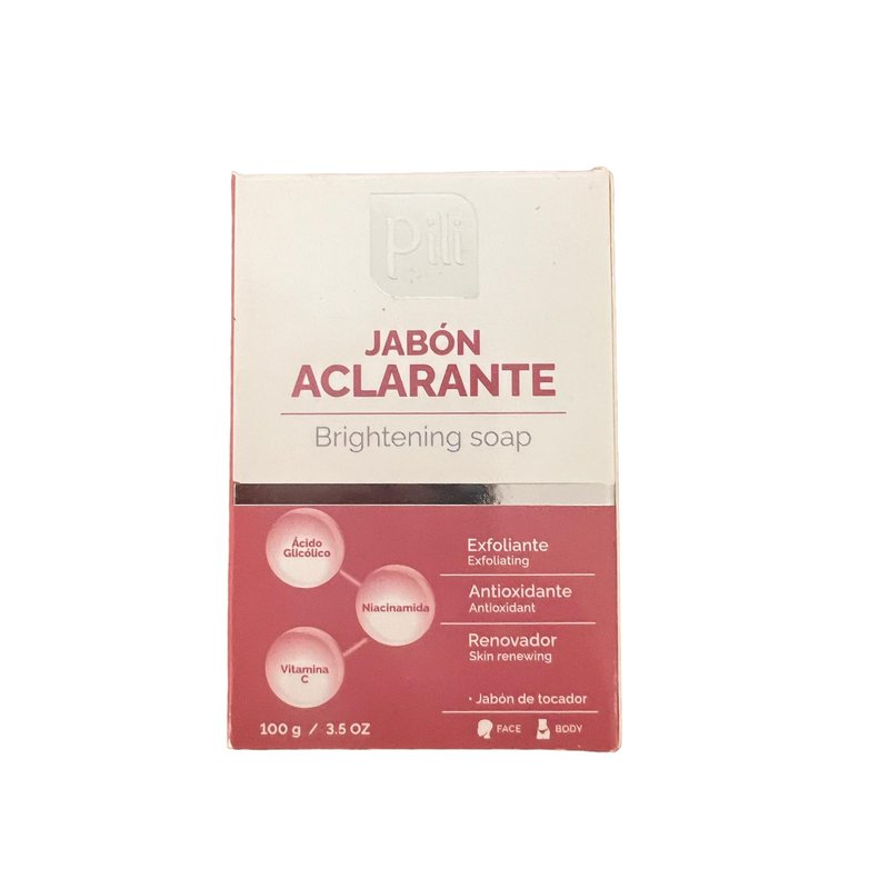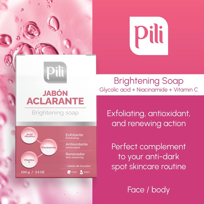 Experience the transformative power of Pili Brightening Soap, the perfect complement to your routine for even-toned skin. Crafted with a potent blend of Glycolic Acid, Vitamin C, and Niacinamide, this soap bar is the key to achieving a luminous complexion. Say goodbye to stubborn dark spots with our Brightening Soap Bar. The dynamic trio of Glycolic Acid, Vitamin C, and Niacinamide works synergistically in your routine to diminish pigmentation, revealing a brighter, more uniform skintone. Elevate your skincare routine with our Facial Skin Brightening Soap. Infused with Vitamin C, it acts as an illuminator, revitalizing dull skin and restoring its natural radiance. Say hello to a glowing, rejuvenated complexion. Unveil smoother, softer skin with our Exfoliating Soap Bar. Gentle yet effective, it gets rid of dead skin cells, leaving behind a renewed and refreshed face. Embrace a smoother texture and a more youthful appearance. Protect your skin against environmental aggressors with our Antioxidant-rich formula. Shielding your skin from free radicals, it helps maintain its youthful vitality and resilience. Indulge in daily renewal with our Skin Renewing Soap Bar. Nourishing and regenerating, it replenishes the skin's moisture barrier, promoting a healthier, more vibrant complexion. Transform your skincare routine with Pili Brightening Soap and reveal the luminous, even-toned complexion you've always dreamed of. Simply wet the skin, lather, and rinse for effortlessly beautiful results. Unlock the secret to radiant skin today.