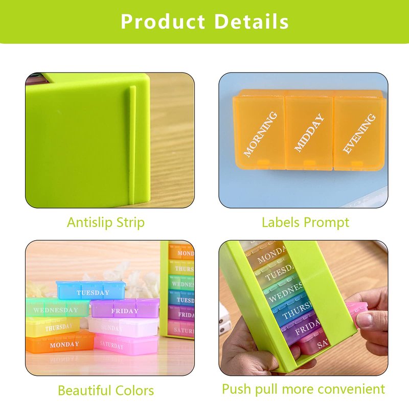- 7 Day 3 Times a Day:The pill manager three times a day has 21 compartments, with 7 different colors and day of week labels. 3 times a day in the morning, noon and evening compartments. Put the daily pill case you need for the most recent day on the bottom floor.