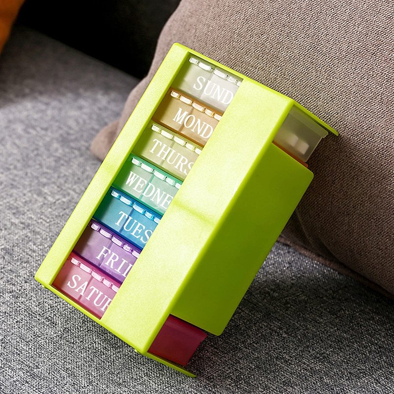 The pill box has 7 movable boxes, each box has 3 separate cube compartments. You can choose to carry only one day (or more) of medication.