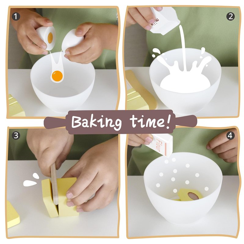 - WOODEN KITCHEN TOYS - All perfectly sized for little hands to hold, little bakers can develop hand-eye coordination and fine motor skills while they pretend to bake. It's a great addition to any playroom and a great toy for developing interest and socializing with kids.