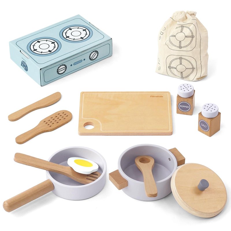 Pillowhale Wooden Toy Pots and Pans Cookware Playset for Kids Kitchen,Toddler Cooking Set,Pretend Play Kitchen Accessories for Toddlers Boys Girls Ages 3+