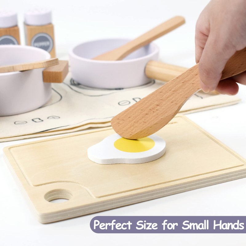 - Kids Kitchen Playset: This quality wooden toy set includes 1 flat frying pan, 1 saucepan, 1 lid, 1 cutting board, 1 knife, 1 wooden knife, 1 spatula, 1 ladle, 1 boiled egg, 1 salt shaker, 1 pepper shaker, and 1 storage bag for all children's kitchen utensils