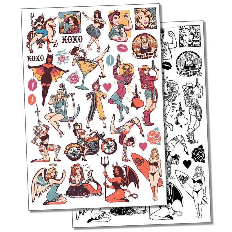 Pin-Up Woman Ladies Temporary Tattoo Water Resistant Fake Body Art Set Collection - Black (One Sheet)