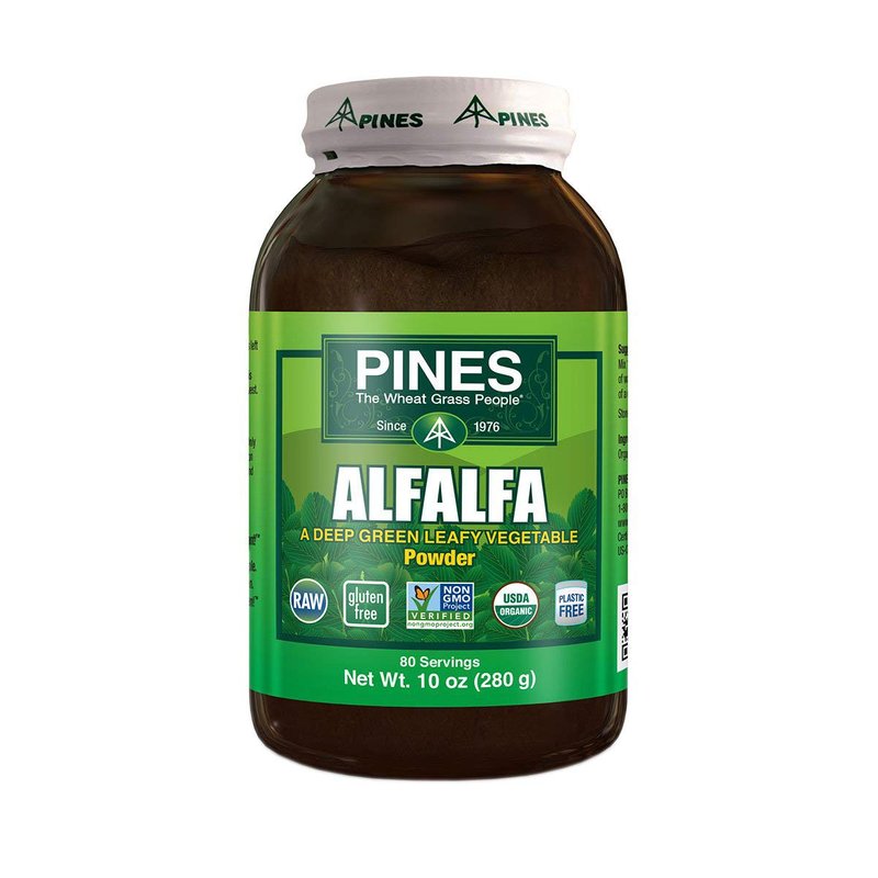 - Pines Alfalfa is the most nutritious alfalfa available, having been grown and packaged with the same exquisite care as our other healthy products. Just one look at its dark green color sets it apart from any other alfalfa.